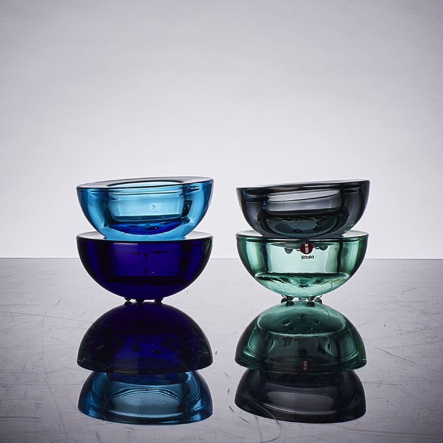 4 st värmeljushållare, pressglas, Iittala, Finland. Höjd: 4,5 cm