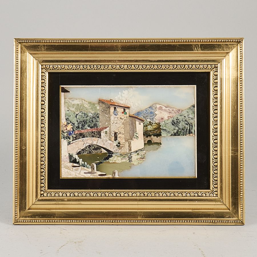 pietra dura, hus/sjö, Italien, 16x23 cm, yttermått inklusive ram: 32x40