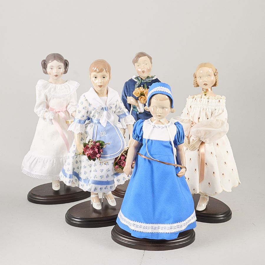 5 st, Bing & Grøndahl, Årsdockor, Trine 1985, Hans 1986, Josephine 1989, Marianne 1987 & Else 1984, på ställningar. Textilklädsel, Höjd: 34-38
