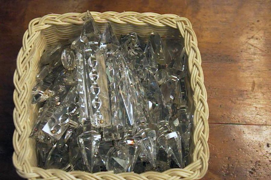 med prismor, stomme i mässing, åtta ljusarmar. Dia..//