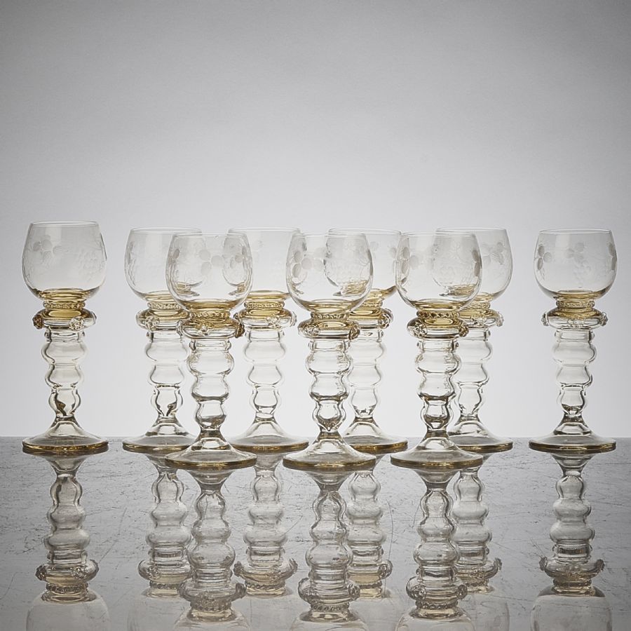 9 st, Reijmyre glasbruk, gultonat glas med etsad dekor. Höjd: 18,5 cm