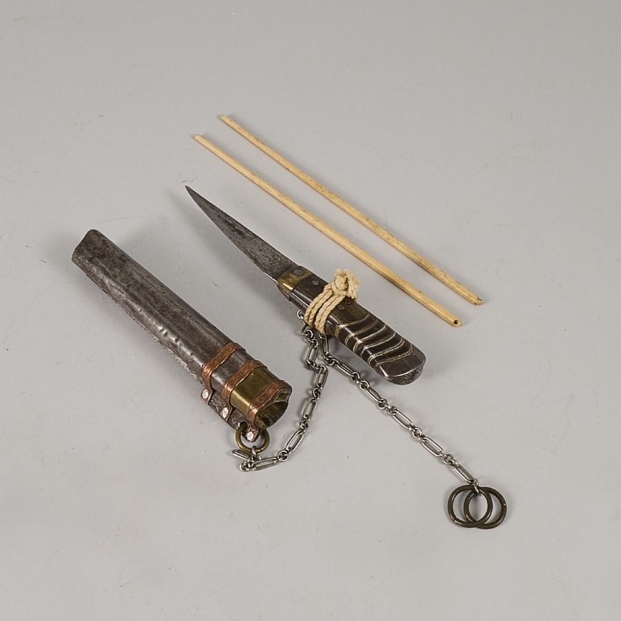 Tibet/Kina, dolk + ätpinnar, metall och trä. Längd: 26 cm