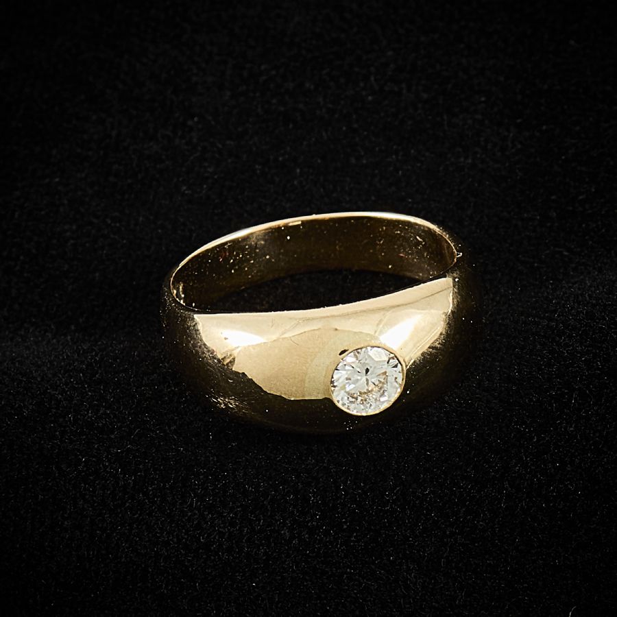 18k guld. Med diamant ca 0,5 ct. Vikt: 11 g. Ringmått: 20 cm