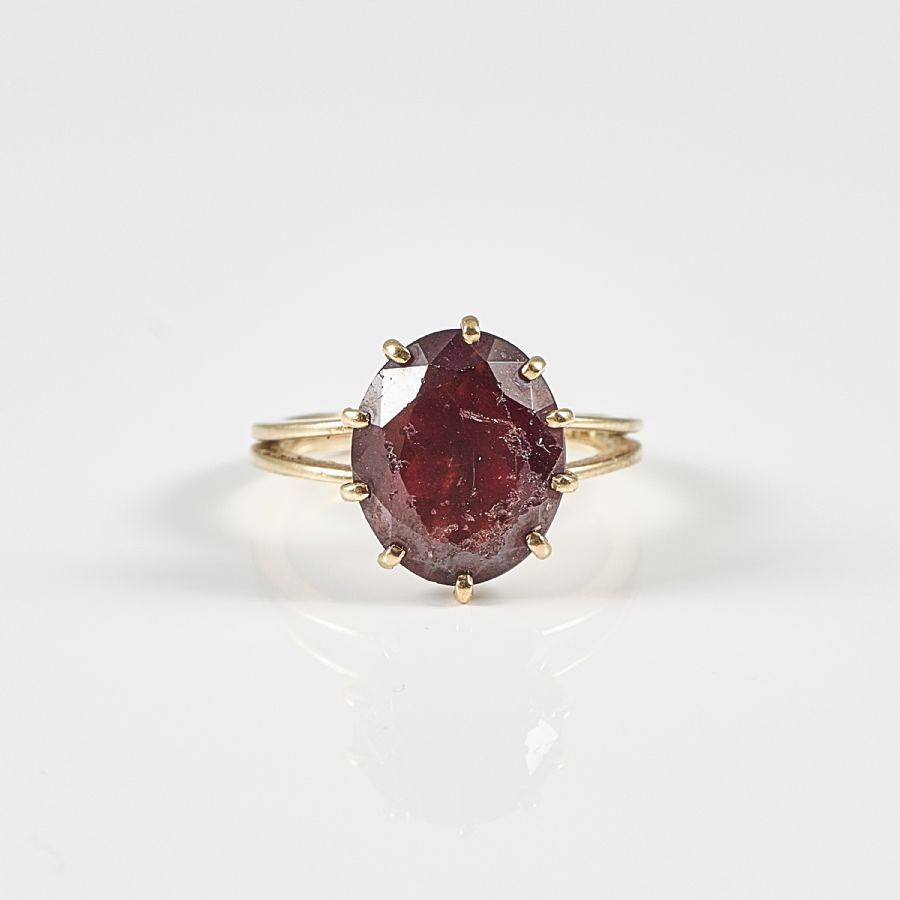 14k, med granat. Vikt: 3,8g brutto. Ringmått: 12