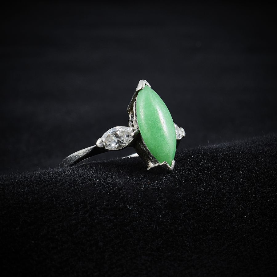 Platina, med navettslipade diamanter & en grön sten, 2xca0,15ct, storlek: 16. Vikt: 4,4g.