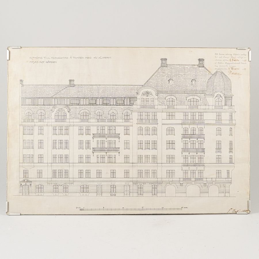 Fastighet, Kv Klippan, Stockholm. Signerad, daterad 1908,43x62, oramad