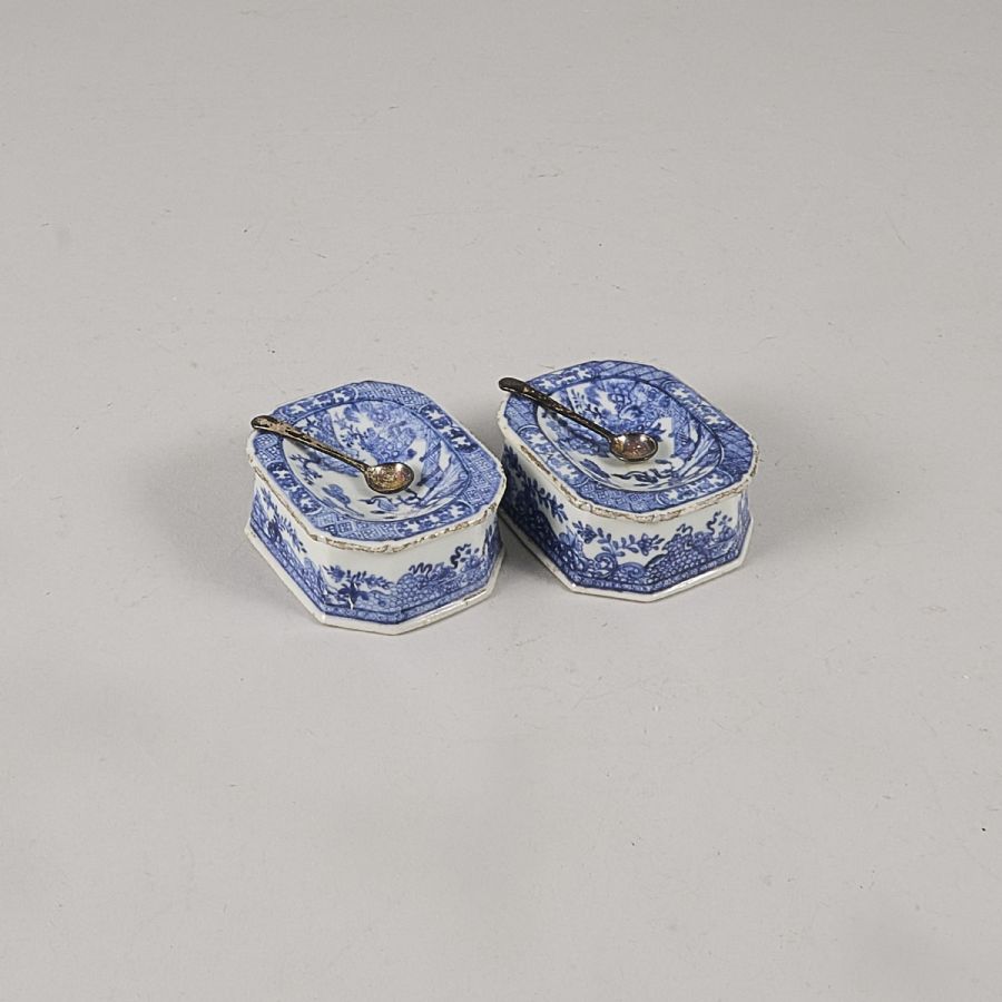 2 st, Kina, Blåvitt kompaniporslin. Längd: 8 cm. Höjd: 4 cm