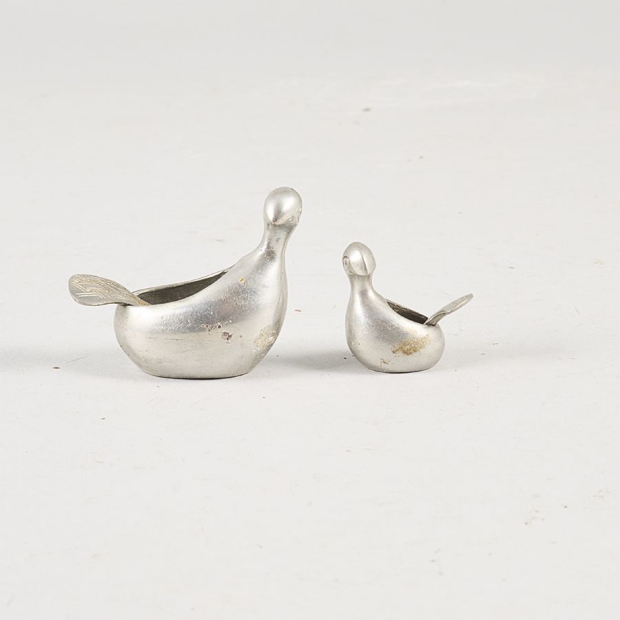 Saltkar, med sked, 2 st, "Kirun", ripa. Tenn. Längd: 3-5. 5 cm