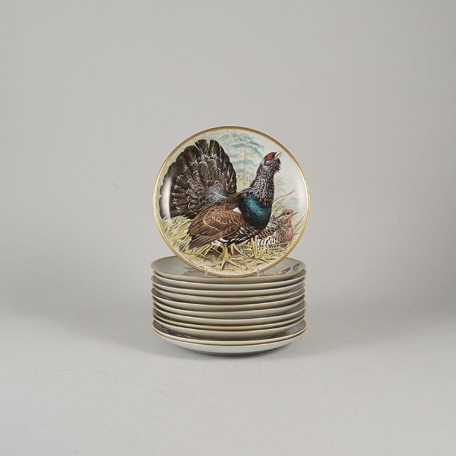 12 st, Franklin Porcelain, Haviland Limoges, Frankrike, fåglar målade av Basil Ede, "Gamebird of the World. Diameter: 23 cm