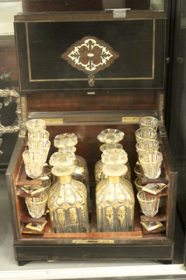med glasinsats; 15 glas, 4 karaffer, höjd: 26 cm, bredd: 32 cm