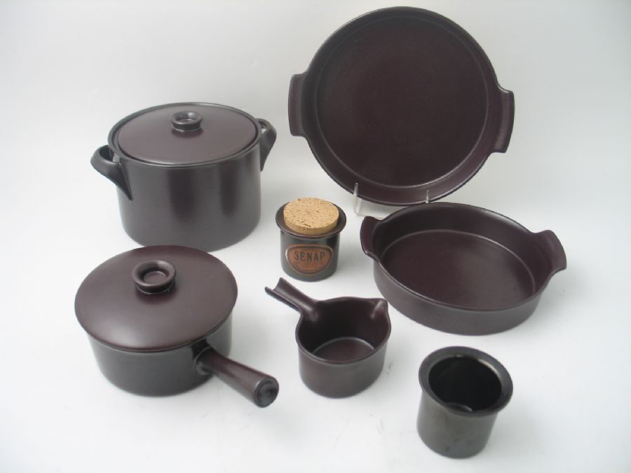 Servisdelar, 6 x ”Terma” + 1 x "apotekets senapsburk", Stig Lindberg (1916-1982) för Gustavsberg, 1955-1979, flamfast gods, brun, 6 delar. Märkning TERMA . FLAMELDFAST . SWEDEN . GUSTAVSBERG (resp. modellnr)". Se katalog ’Stig Lindberg - formgivare’, Nationalmusei utställningskatalog nr 456, Stockholm 1982, sid 30
