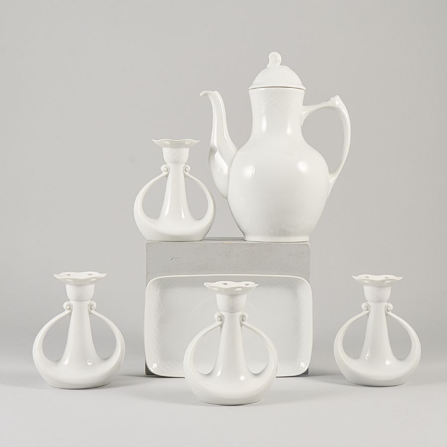 6 delar, Bing & Grøndahl, "Elegance", 4 ljusstakar, 1 kaffekanna, 1 fat, vitt porslin. Höjd: 14- 26 cm