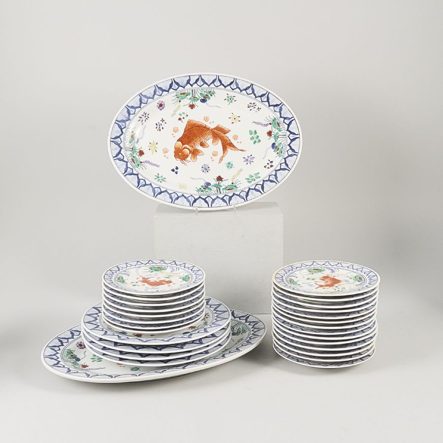 4 mattallrikar, 22 assietter, 2 uppläggningsfat, med motiv av karpar. Diameter: cm