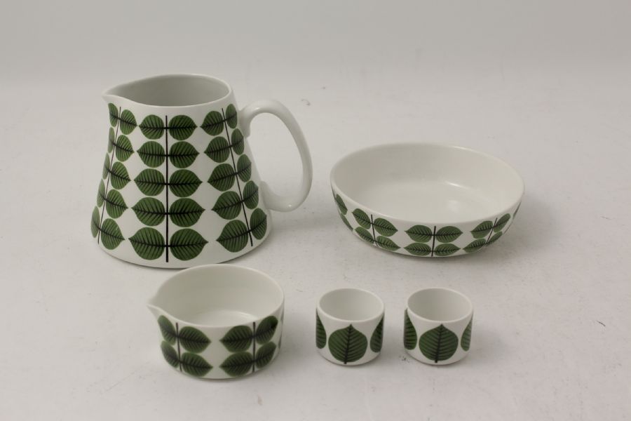 Servisdelar, Stig Lindberg (1916-1982), Berså, Gustavsberg 1960-1974, stiliserade gröna blad på vit botten, 5 delar
