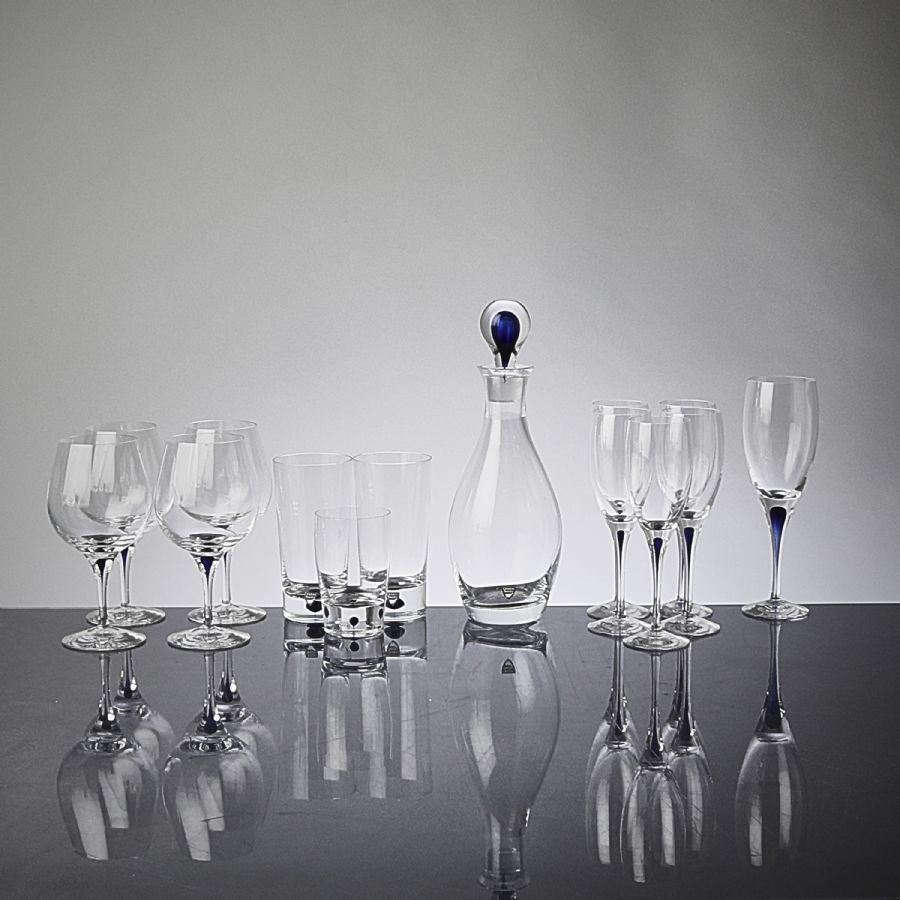 14 delar, Erika Lagerbielka, Orrefors, Intermezzo. Glas, fot med dekor av blå droppe, Höjd: 11-30 cm