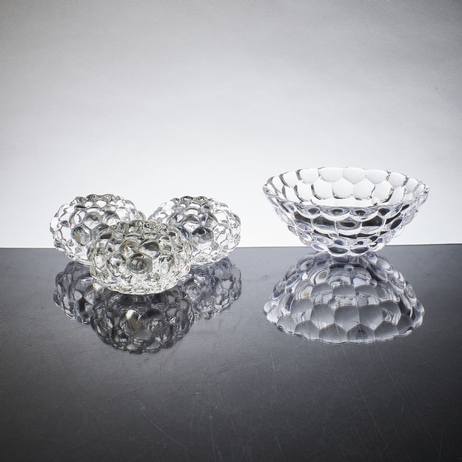 Skål, + värmeljusstakar, 4 delar, "Hallon", design: Orrefors. Diameter: 11-19 cm