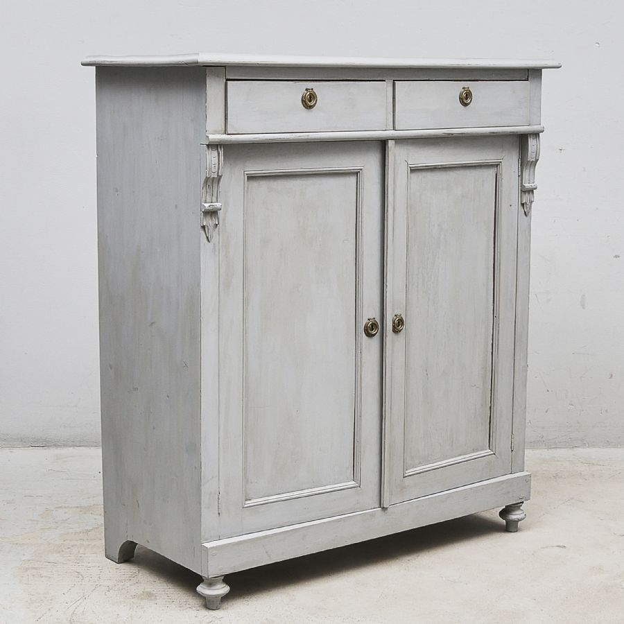 1890-tal, Nyrenässans, grålaserat, två lådor, ett dörrpar med baklomlligande hyllinredning. Bredd: 103 cm, djup: 46 cm, höjd: 115 cm