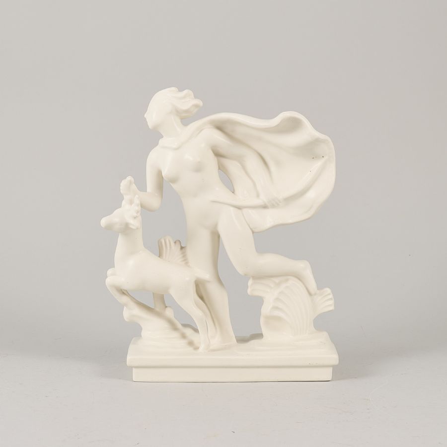 SCULPTURE, "Diana", Gefle. Flintgods med vit glasyr. Signerad Percy i godset. Höjd: 27 cm. Bredd: 23 cm