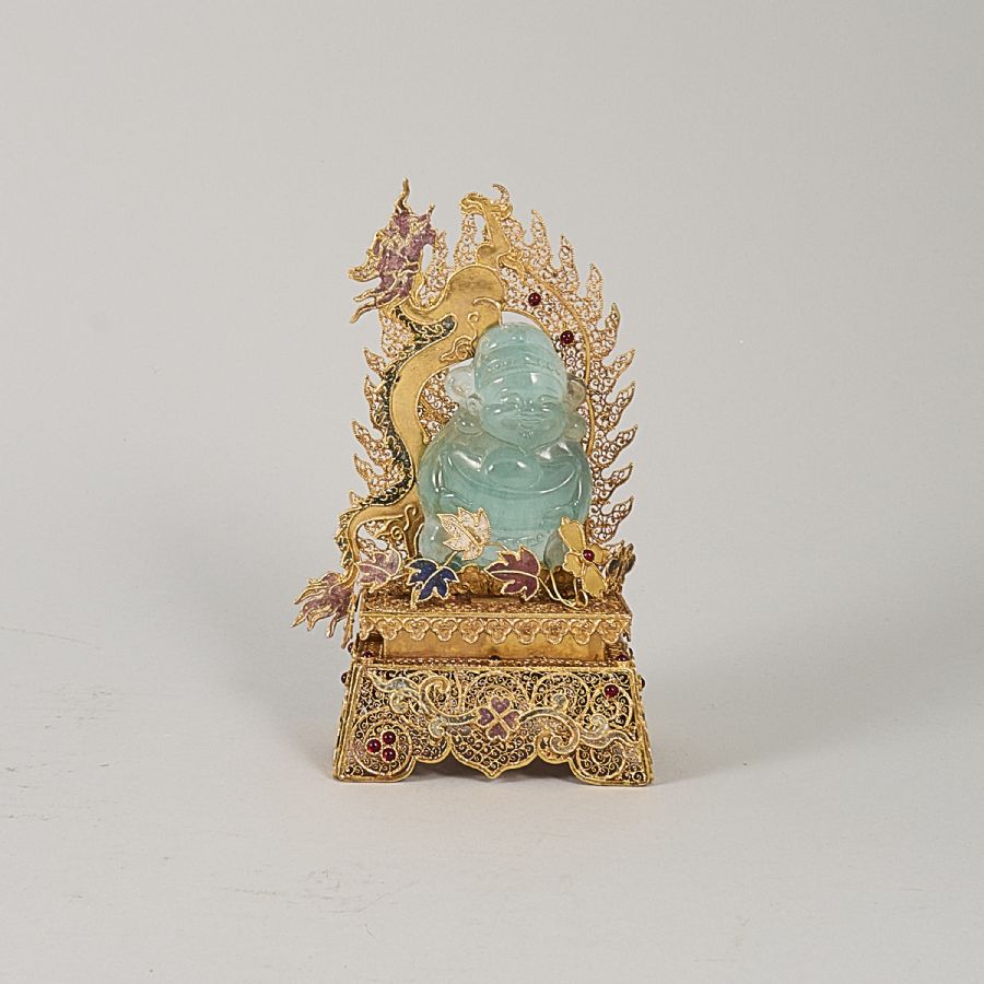Buddha, jade, förgylld metall, i låda. Höjd: 19 cm