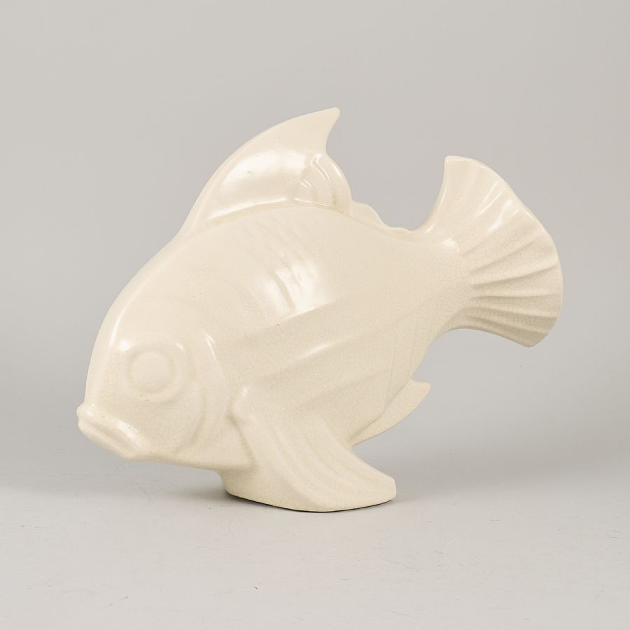 LeJan, Belgien, 1900-talets första hälft. Skulptur i form av fisk. Glaserad keramik med krackelyrer. Höjd: 31 cm. Längd: 40 cm