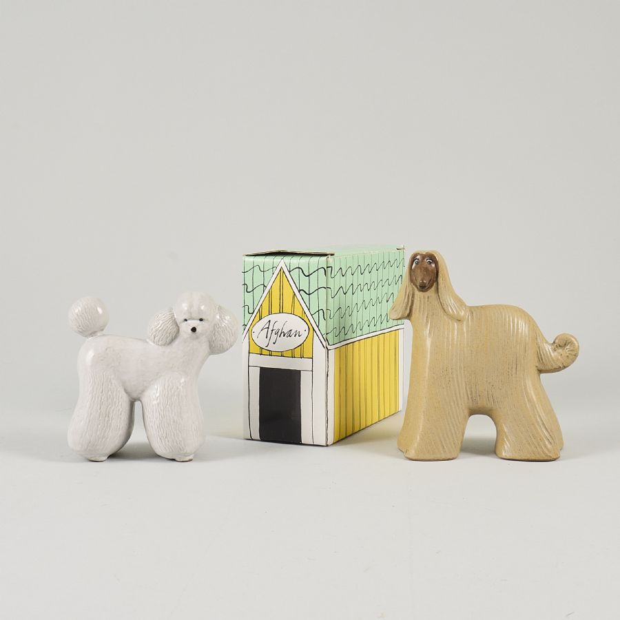 Skulpturer, 2 st, Ur serien VOV för Åhléns, Pudel & Afghan, glaserad stengodslera. Längd: 11-13. Höjd: 11-13,5