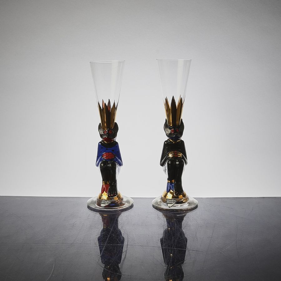 Snapsglas, 2 st, Nobel, jubilee 1901-1991, Gunnar Cyrén (1931-2013), Sverige, Orrefors, "Djävul". Höjd: 16,5 cm