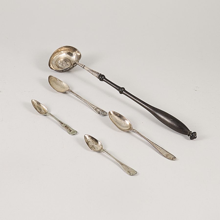 + spoons, silver, 5 parts. Length: 13, 5-42, weight: 250 gr brutto, wooden handle, slev ej stämplar.