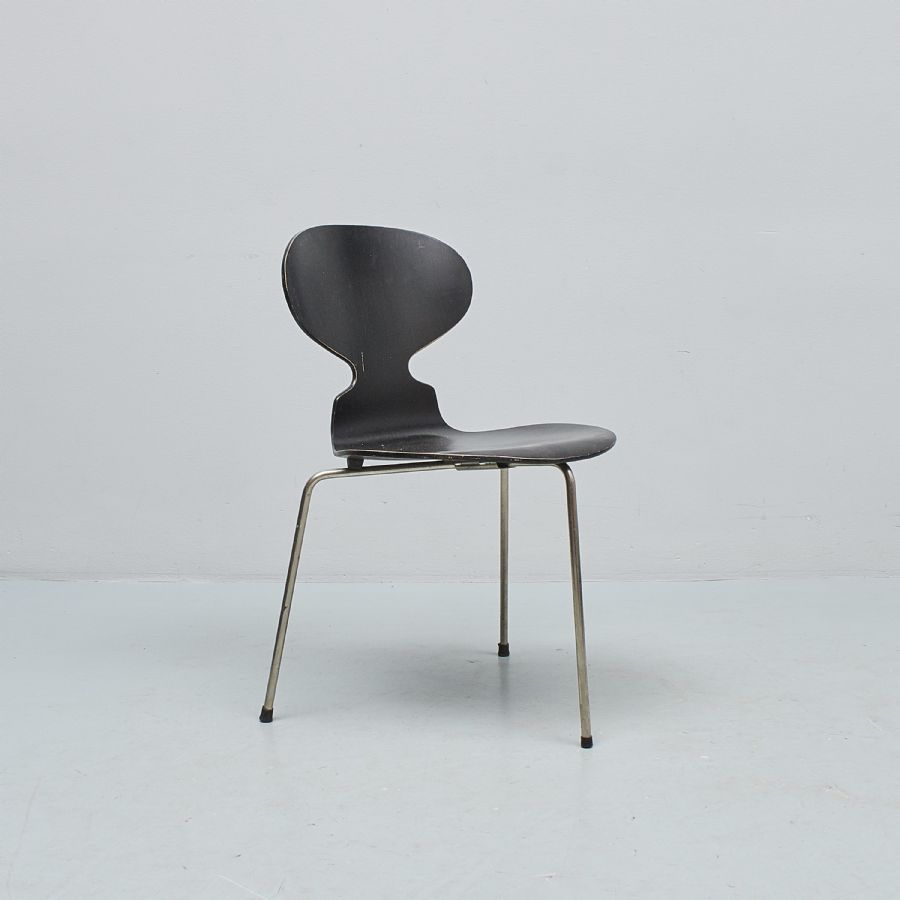 Arne Jacobsens Myran lanserades 1952. Är en skalstol av laminerat trä och stålrörsben. Producerad av Fritz Hansen, Danmark.