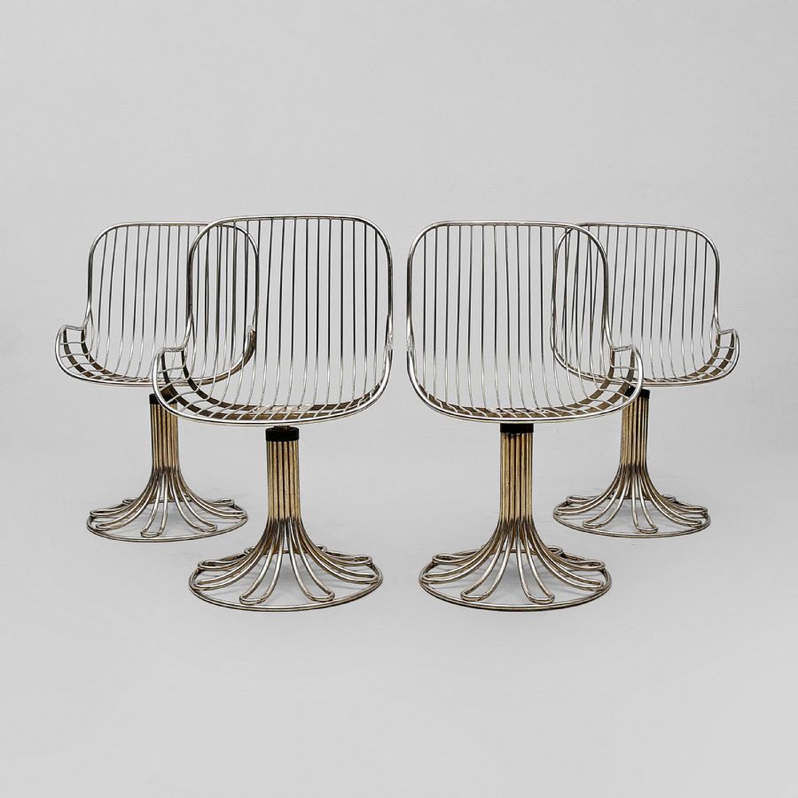 4 st, Italien, kromad metall, trumpetfot. Höjd: 82 cm sitthöjd 42 cm. Bredd: 50 cm
