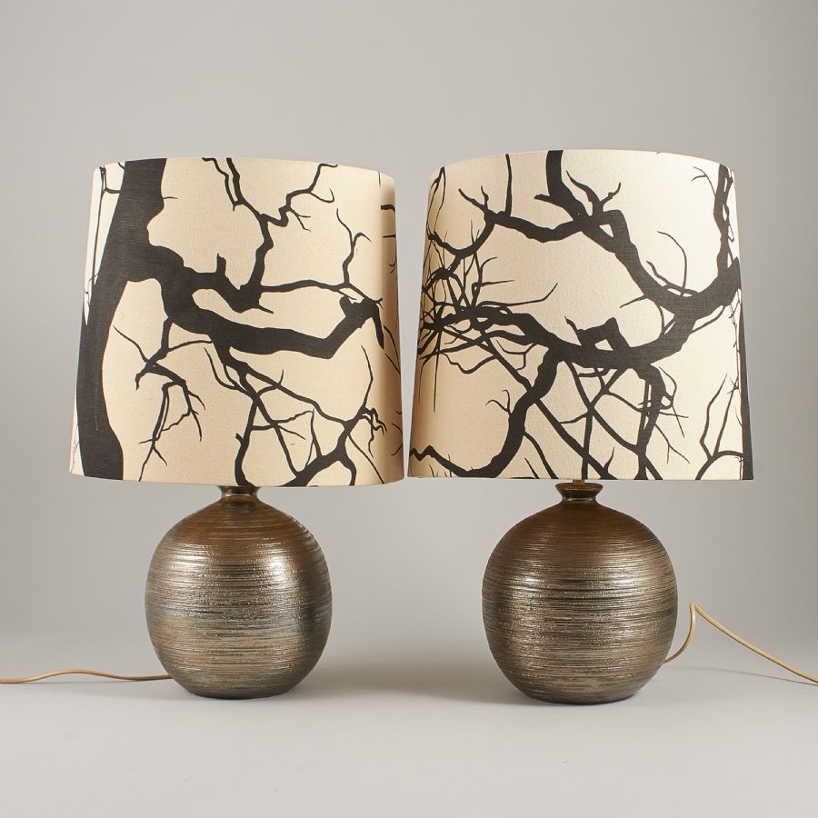Ett par, keramik, 1960-tal, skärmar med tyg design Johan Carpner. Höjd: 55 cm