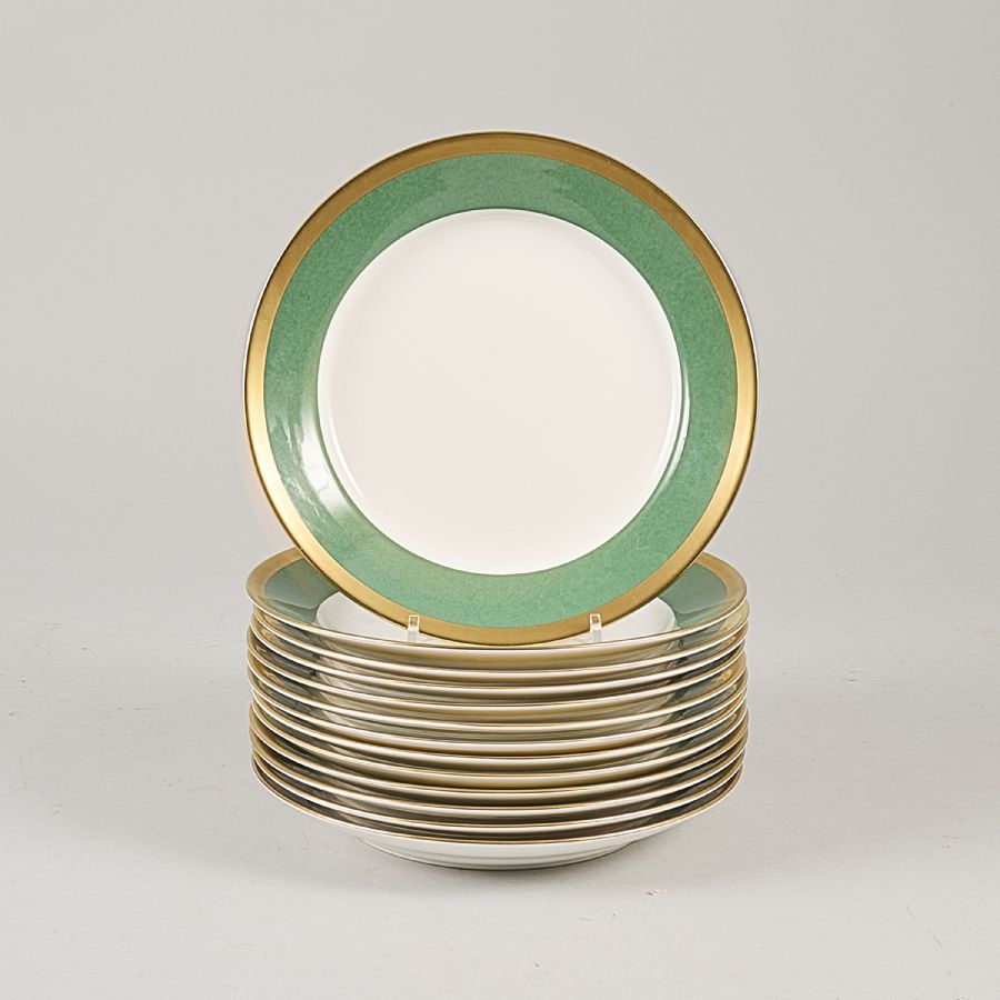 PLATES, 13 st, Rörstrand, "Nobel", vita med grönt brätte och förgylld kant. Diameter: 22 cm