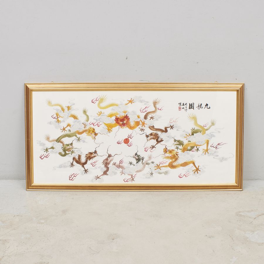 Kina, Sidenbroderi, Motiv med Drakar, 66x145 cm, yttermått inklusive ram: 78x157 cm