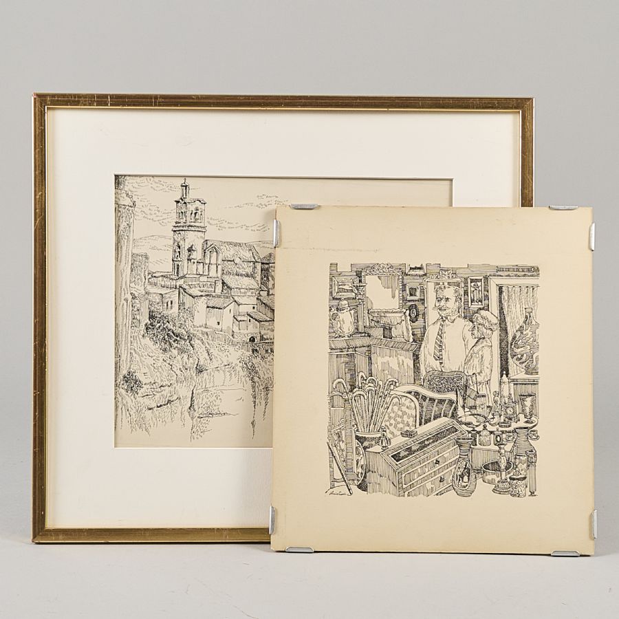 Teckningar, 2 st, Tusch, Signerad, yttermått inklusive ram: 25x23-32x36 cm