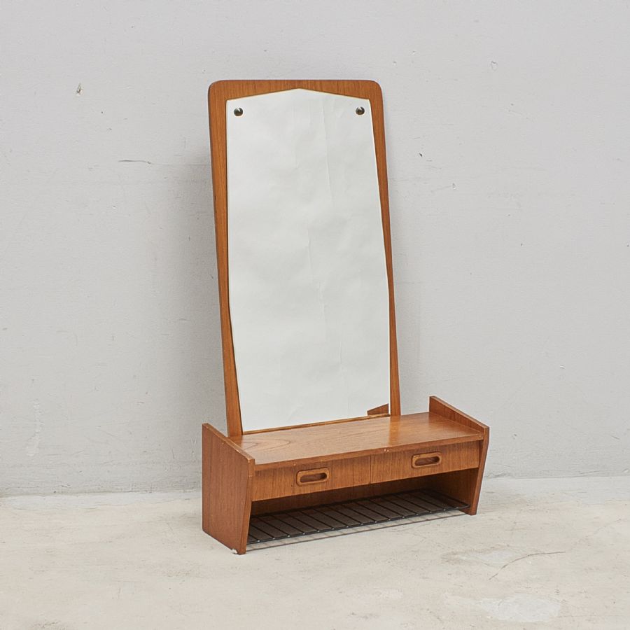 + spegel, 1950-tal, teak, bland annat Fröseke. Bredd: 59 cm, djup: 22 cm. Höjd: hylla 24 cm, spegel 95 cm