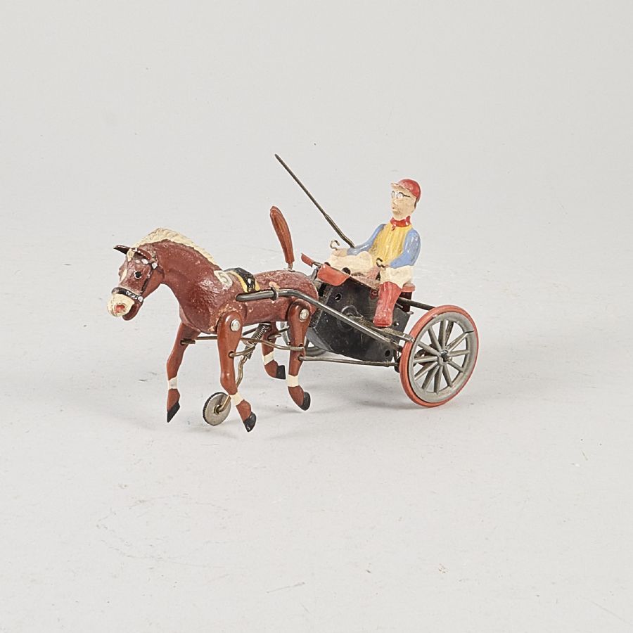 Travhäst, bemålad elstolin och metall. Längd: 16 cm