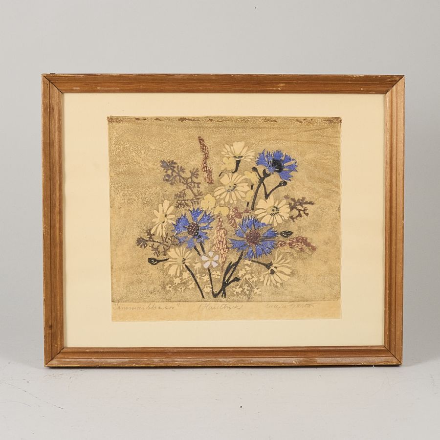 Träsnitt, Maja Fjaestad (1873-1961), Sverige, "Sommarblommar". Bildmått: 27x31 cm, yttermått inklusive ram: 39x48
