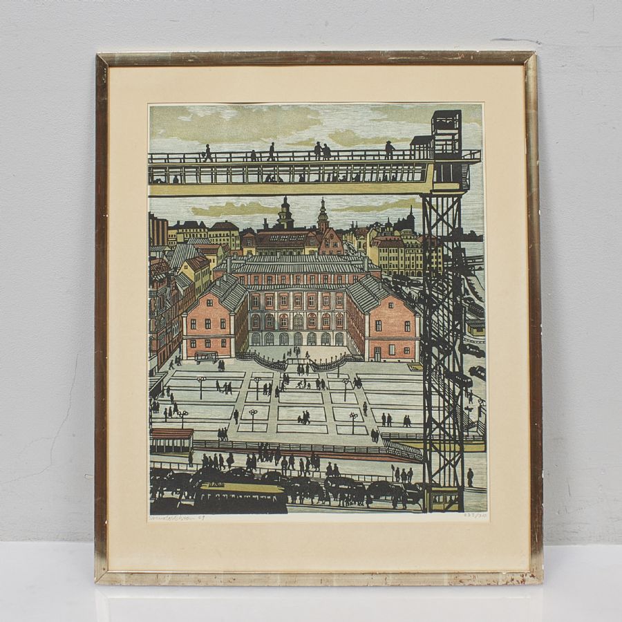 Träsnitt, Svenolov Ehrén (1927-2004), 283/310,1969, Södermalmstorg, Katarinahissen, bildmått: 57x47 cm, yttermått inklusive ram: 76x64 cm