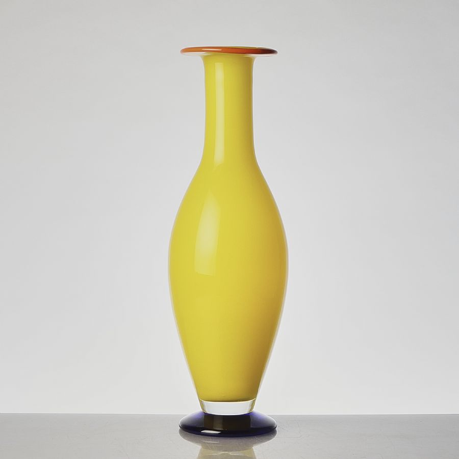 Vas, Orrefors, gult glas med orange myssing, blå fot, höjd: 57,5 cm