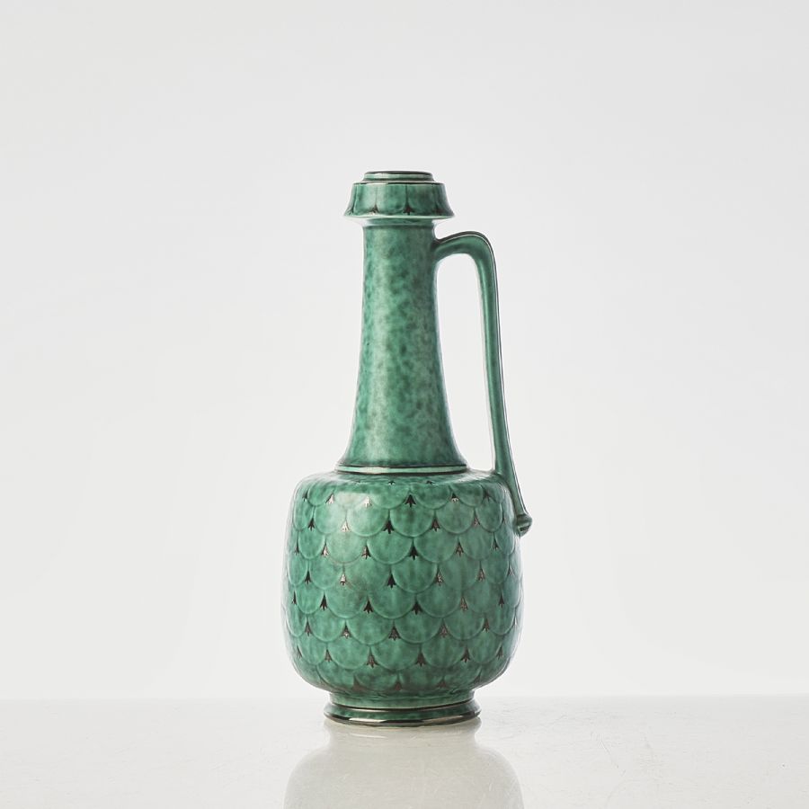 Vas med hänkel, Argenta, Gustavsberg. Stengods, grön glasyr med målad silverdekor, Silverstämpel. Höjd: 29,5 cm