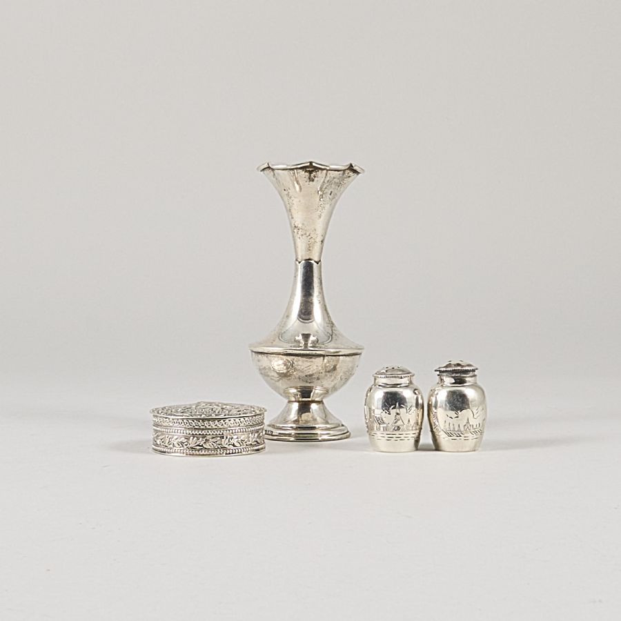 + salt/pepparströare + dosa, 4 delar, silver, vas med fylld fot. Höjd: 2-13 cm, diameter: 5 cm, vikt: 210g brutto