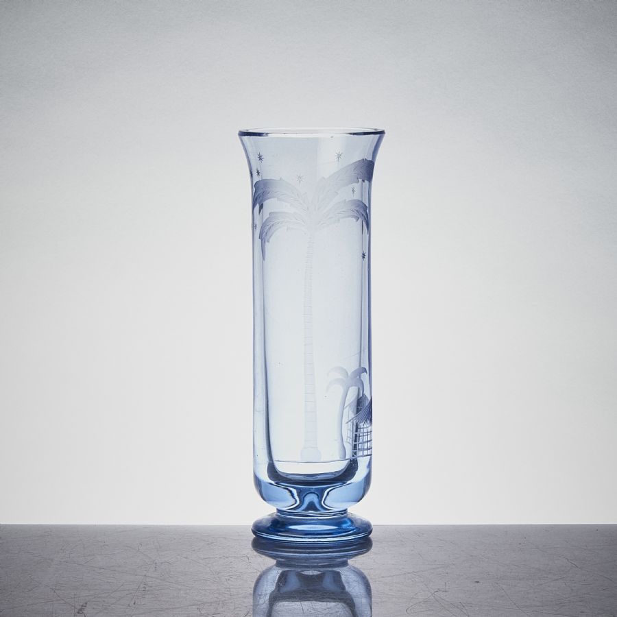 Slipad dekor med palmer, Riihimäen Lasi, daterad -38, blåtonat glas. Höjd: 20 cm
