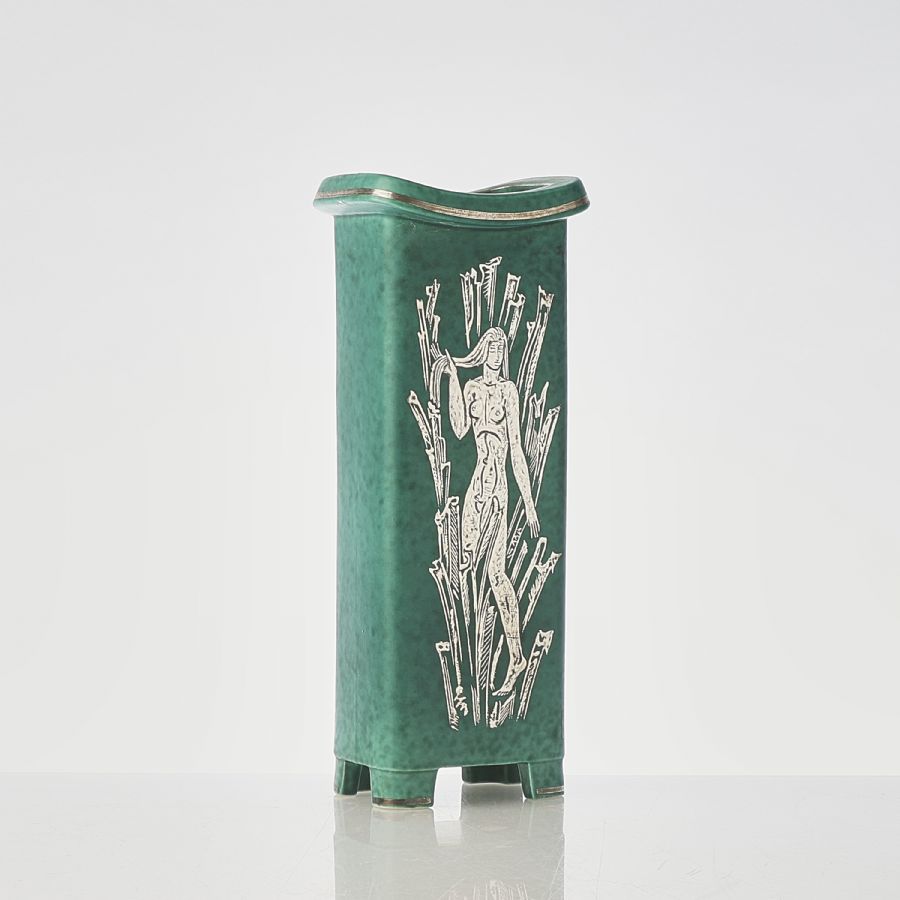 Wilhelm Kåge (1889-1960), Sweden. Argenta, Gustavsberg, Sweden. Stoneware, grön glasyr med målad silverdekor, silver. Dekor med stående kvinna, height: 29, 5 cm,