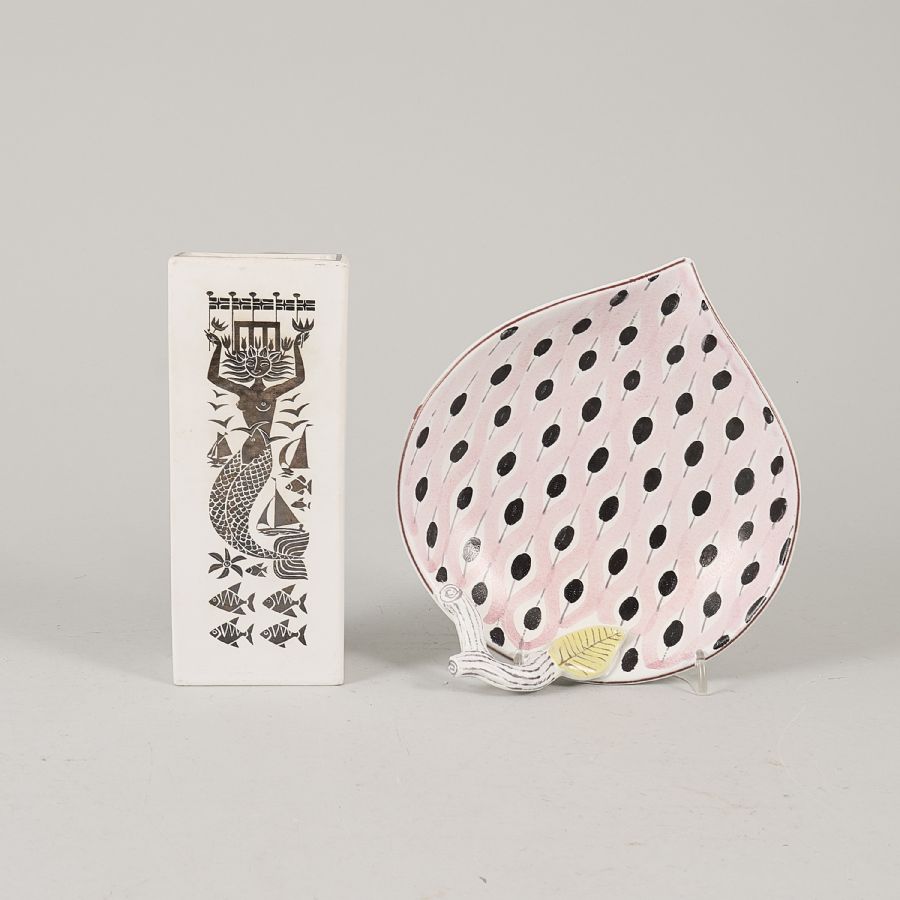 + dish, Stig Lindberg (1916-1982), Sweden. Gustavsberg, Sweden. Vas "Grazia" + fat i fajans. Height: 18 cm (vasen), fatet med fajanssläpp/nagg.