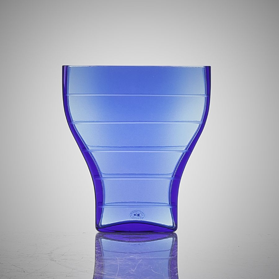 Vas, Reijmyre Glasbruk, blått glas, etsad dekor av ränder. Signerad. Höjd: 18 cm