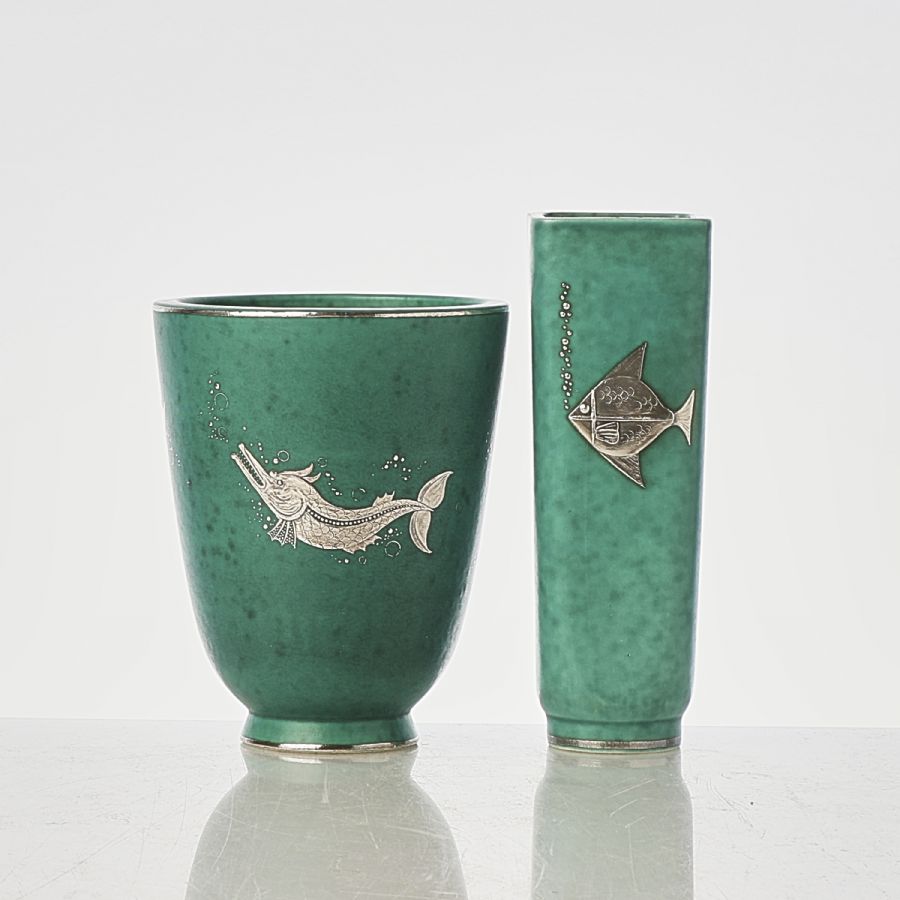 Vaser, 2 st, Argenta, Gustavsberg. Stengods, grön glasyr med målad silverdekor. Höjd: 15-18 cm