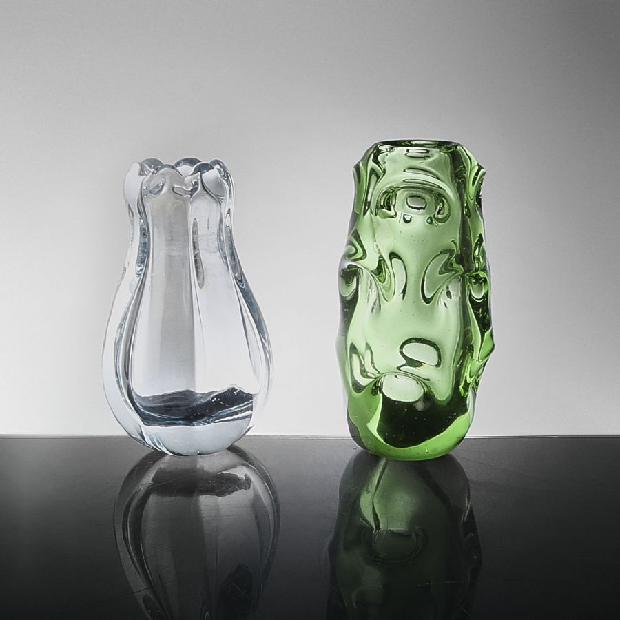 2 pcs, Vicke Lindstrand (1904-1983), Sweden. Orrefors Glassworks, Sweden. Grönt respektive ofärgat glas. Height: ca 23 cm,