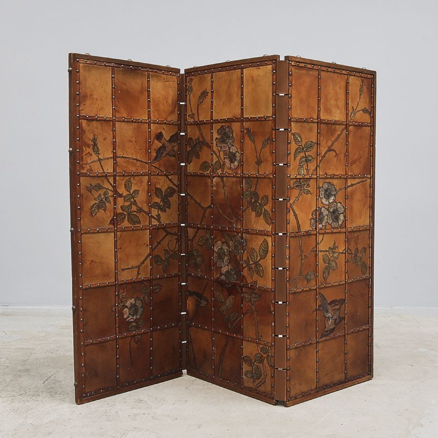 3 delad, ram i teak, skärmar i skinn med reliefdekor av blomster. Höjd: 117 cm. Bredd: 48x3 cm