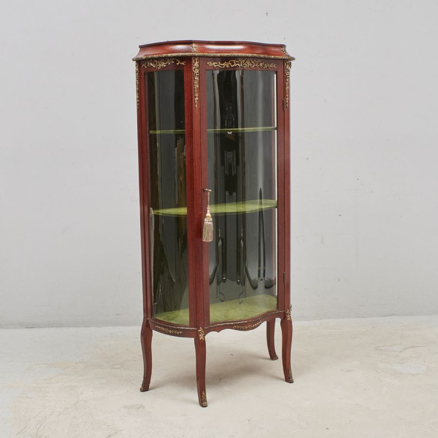 Louis XV-stil, 1900-tal, mahogny, klädda hyllplan i grönt, metallbeslag. Bredd: 65 cm, d 34 cm. Höjd: 142 cm