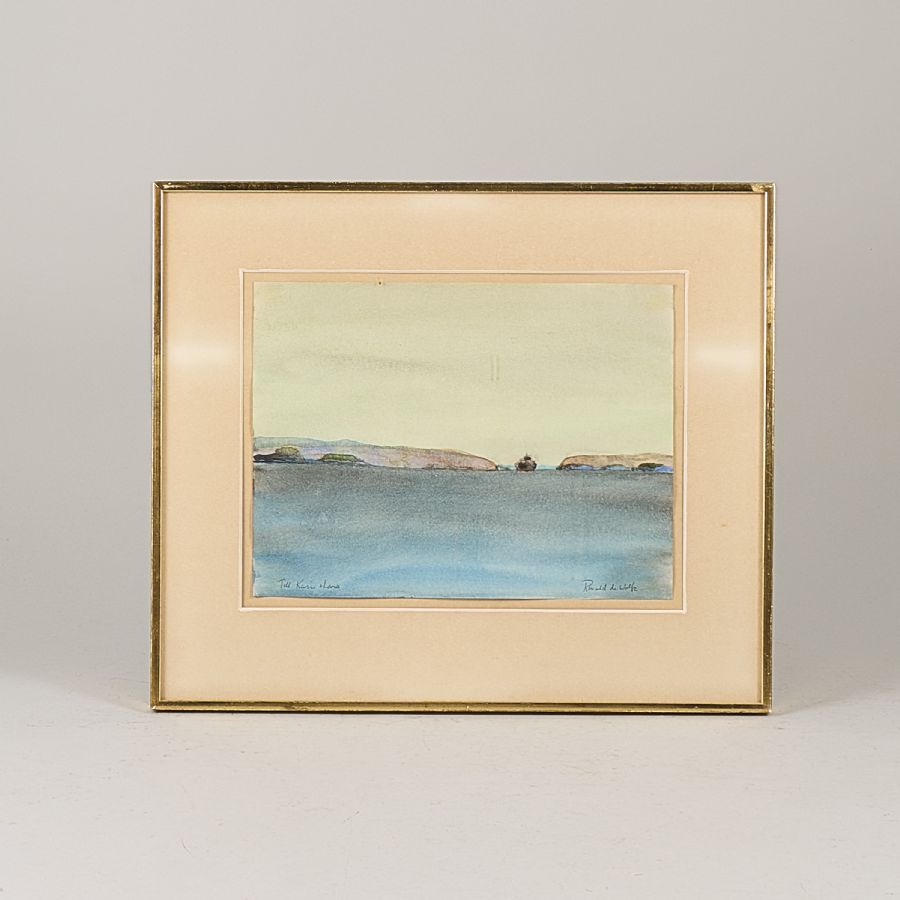Signerad, akvarell, med dedikation "till Karin & Lars", kustlandskap, bladmått: 24x32 cm, yttermått inklusive ram: 40x47 cm