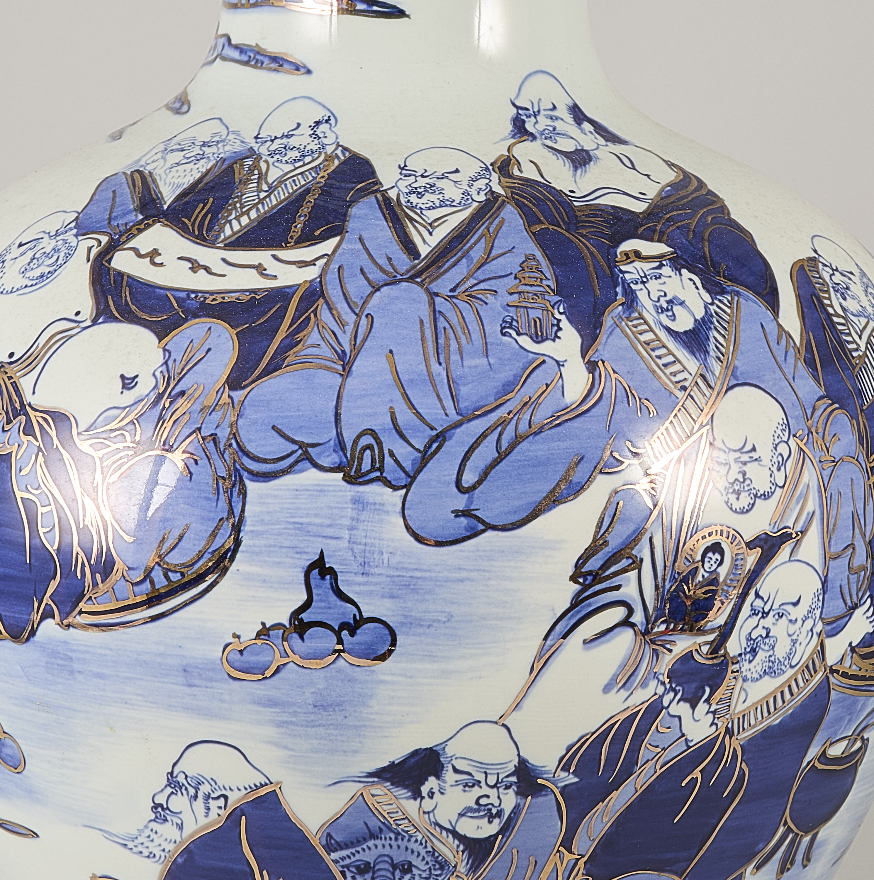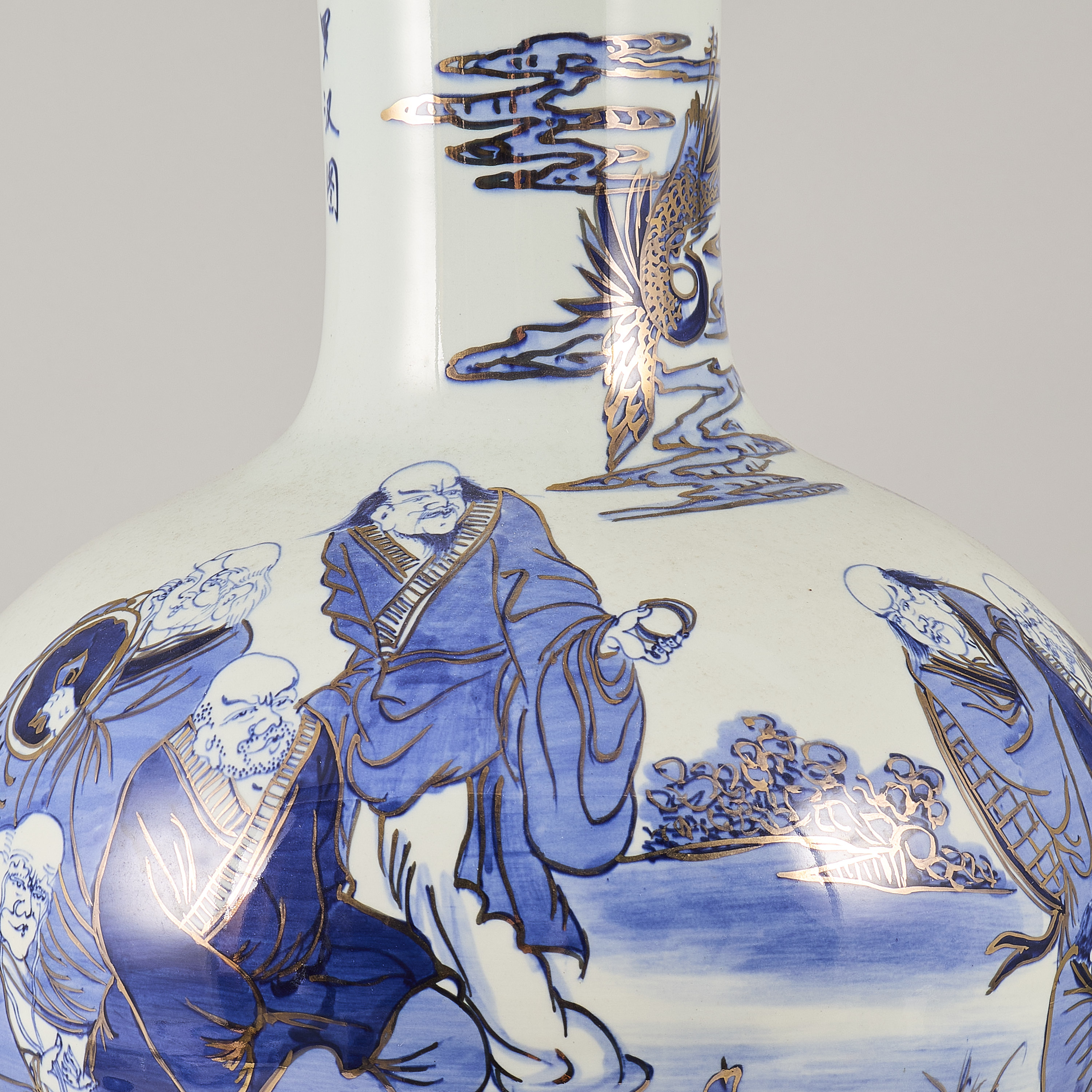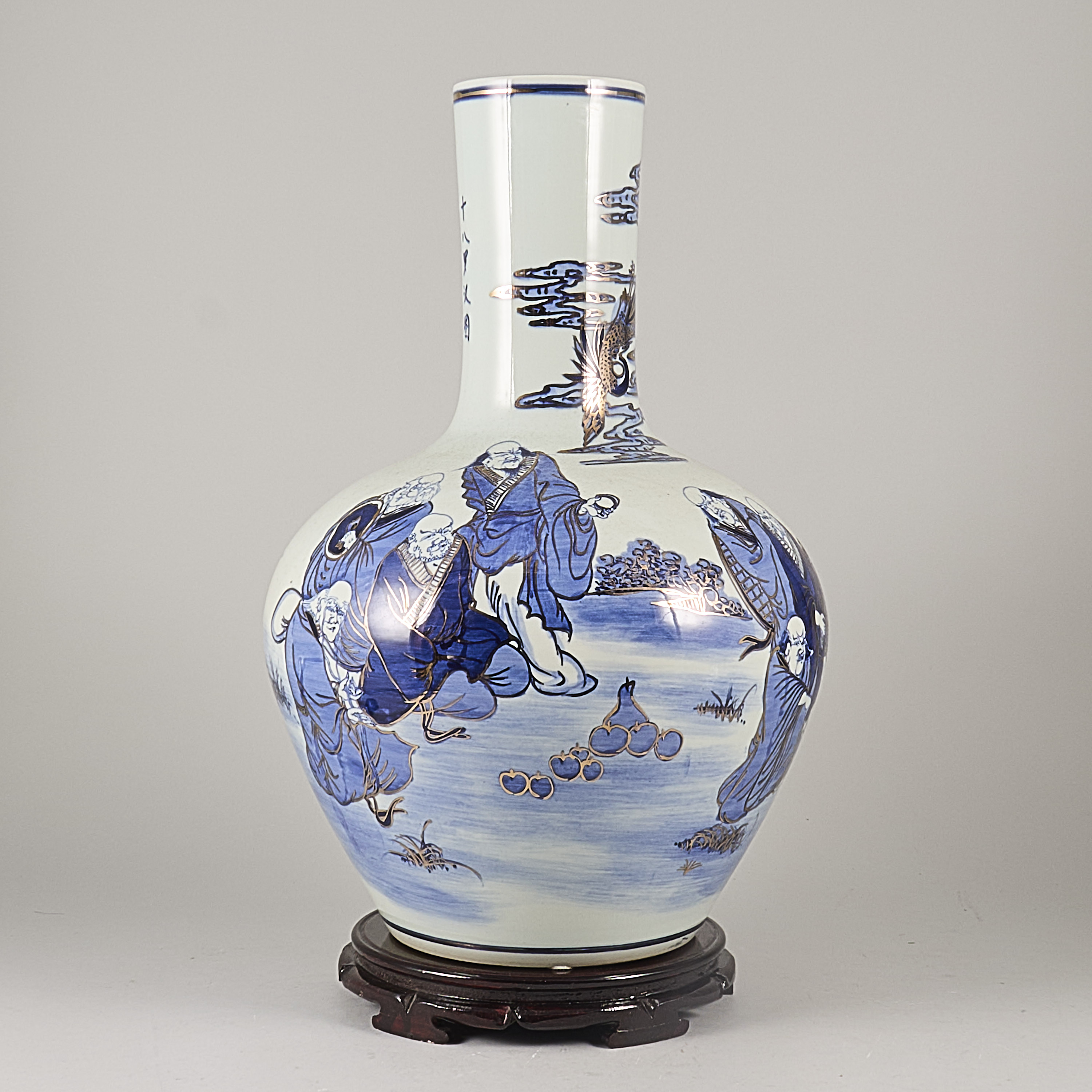 + sockel, Kina, Nutid, dekor med ämbetsmän. Höjd: 58-63 cm